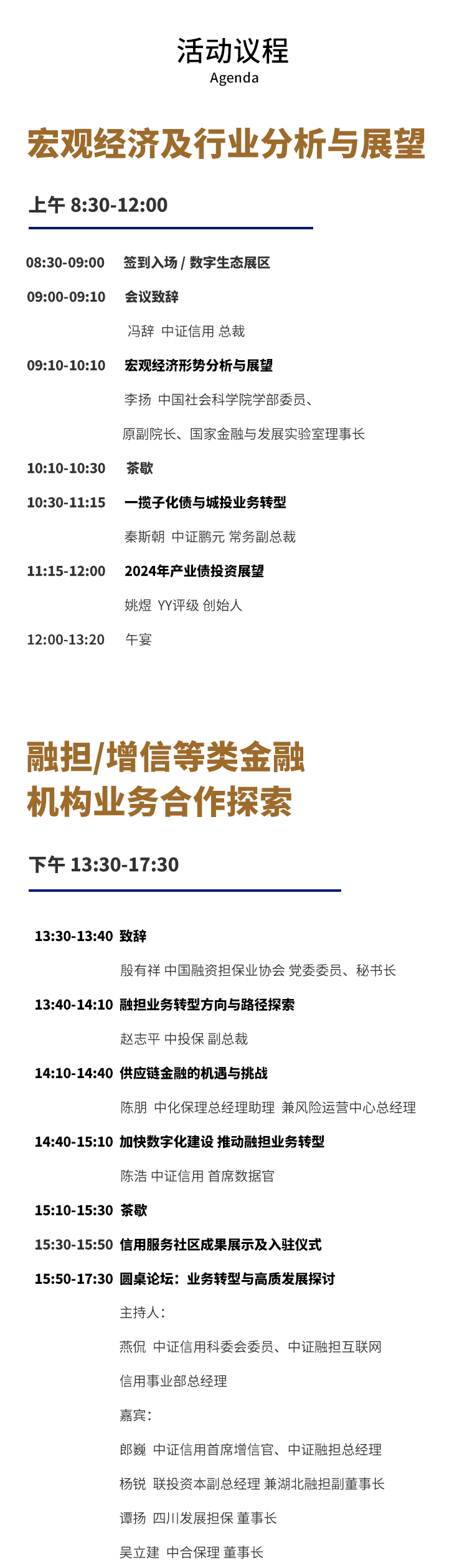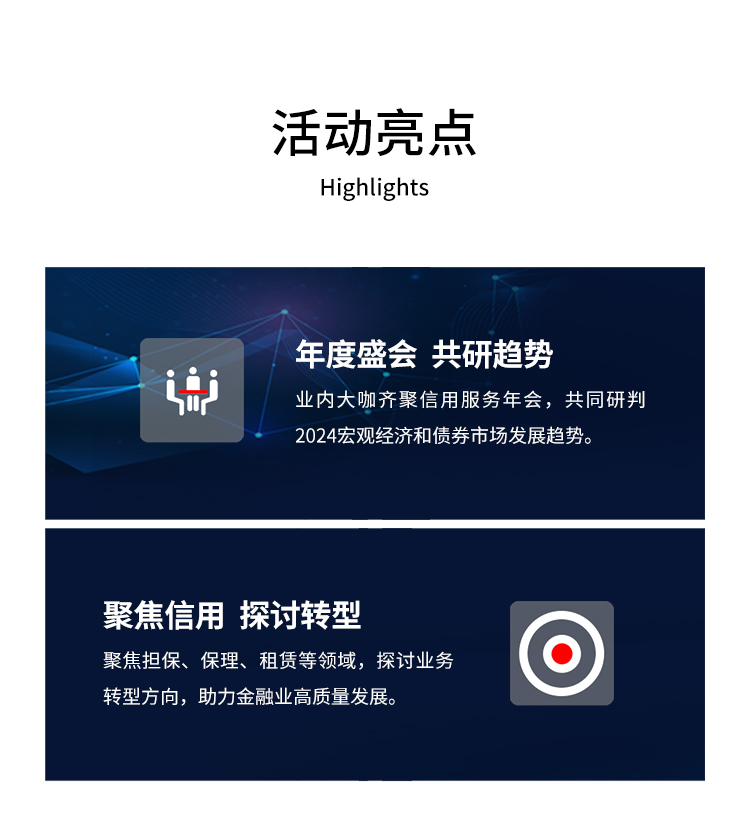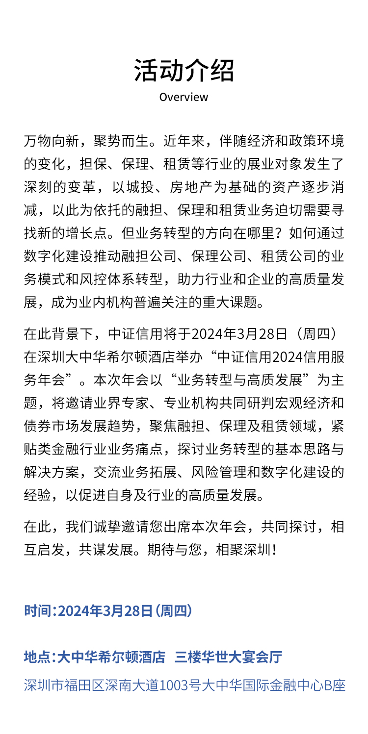 在此背景下,中证信用将于2024年3月28日(周四)在深圳大中华希尔顿酒店举办“中证信用2024信用服务年会”。本次年会以“业务转型与高质发展”为主题,将邀请业界专家、专业机构共同研判宏观经济和债券市场发展趋势,聚焦融担、保理及租赁领域,紧贴类金融行业业务痛点,探讨业务转型的基本思路与解决方案,交流业务拓展、风险管理和数字化建设的经验,以促进自身及行业的高质量发展。